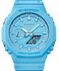 Casio G-Shock GA2100-2A2. Dubbed the "CasiOak" due to the octagonal bezels resemblance to the famous "Royal Oak" from Audemars Piguet. Blue high-strength resin case and band, reinforced with carbon fibers for extra toughness. Blue dial. A mere 11.8 mm thick, which is the thinnest among G-SHOCK combination models. Features include stopwatch, count-down timer, world time, and a built-in LED. Water resistant to 200 meters.