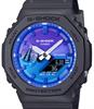 Casio G-Shock Casioak model GA2100FL-1A. The cool blue gradient vapor deposition dial is vividly designed to evoke the image of a high-temperature flame. Black resin case with a black resin strap painted with a gray gradient paint that evokes white smoke. Mineral glass crystal. Water resistant to 200 meters. Functions include World time, stopwatch, timer, and alarm(s).