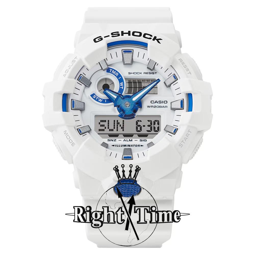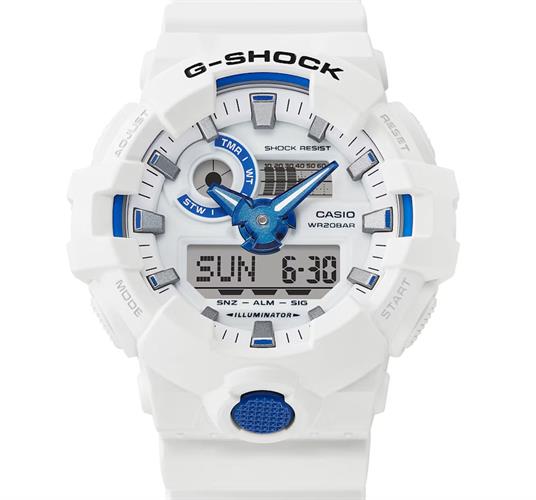 G-Shock GA700HDS-7A by Casio. White case. White 3-D dial with blue color accents. White band. Shock Resistant. Front-Button Super Illuminator Light. 200 Meter Water Resistant.