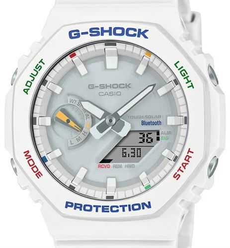 Casio G-Shock model GAB2100FC-7A. Dubbed the "CasiOak" due to the octagonal bezels resemblance to the famous "Royal Oak" from Audemars Piguet. White resin case and band. Multicolor accents on the bezel. White dial with multicolor accents. Features include solar power, Bluetooth, stopwatch, count-down timer, world time, and a built-in LED. Water resistant to 200 meters.