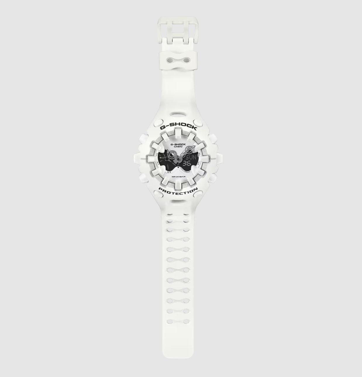 G-Shock GAV01 Series by Casio. White case. Analog/Digital black display. Magnetic resistance. 200 meters water resistant.