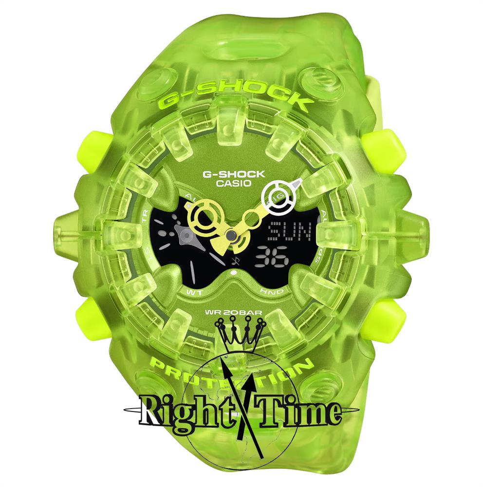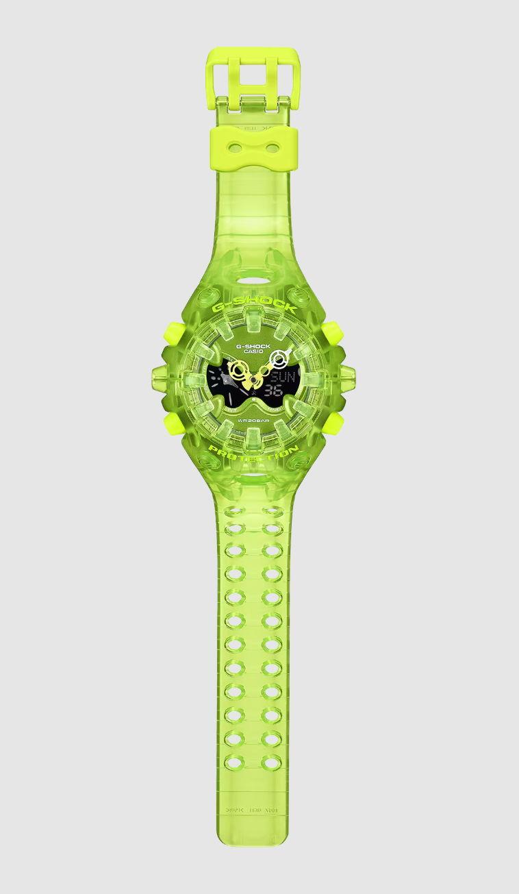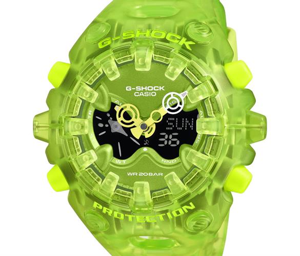 G-Shock GAV01 Series by Casio. Lime green translucent case. Analog/Digital black display. Shock resistance. 200 meters water resistant.