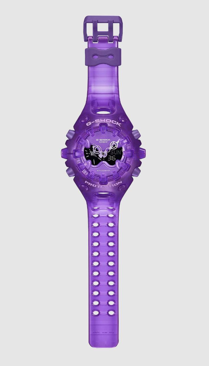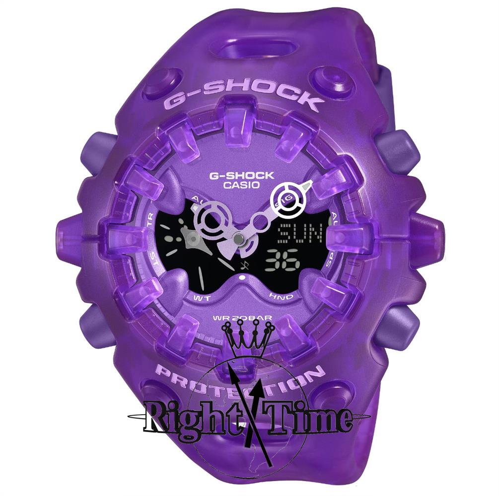 G-Shock GAV01 Series by Casio. Purple translucent case. Analog/Digital black display. Shock resistance. 200 meters water resistant.