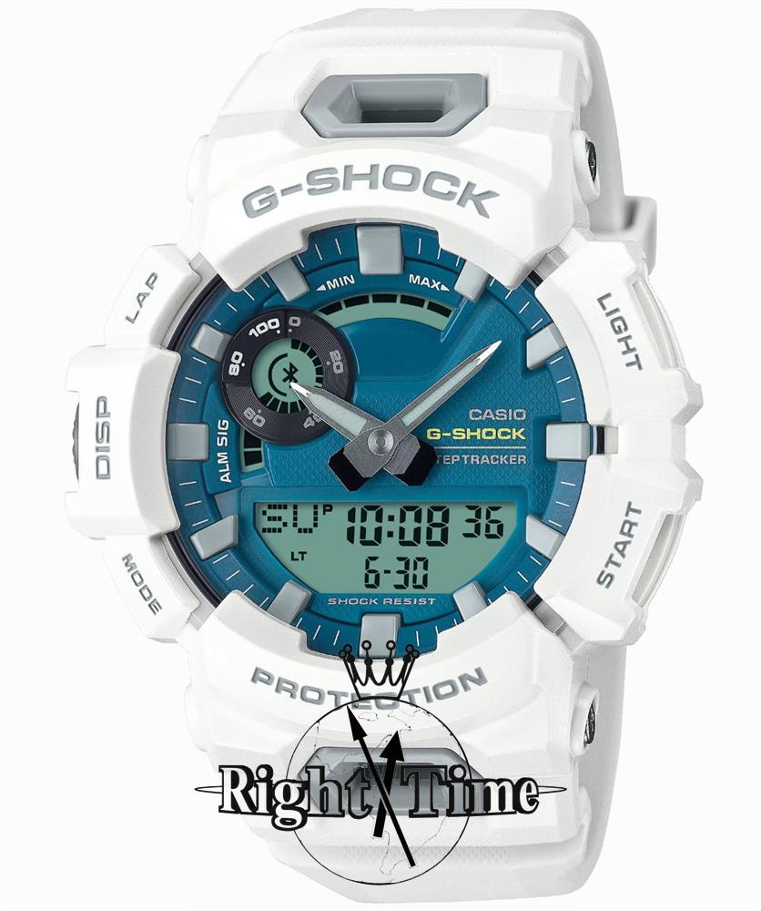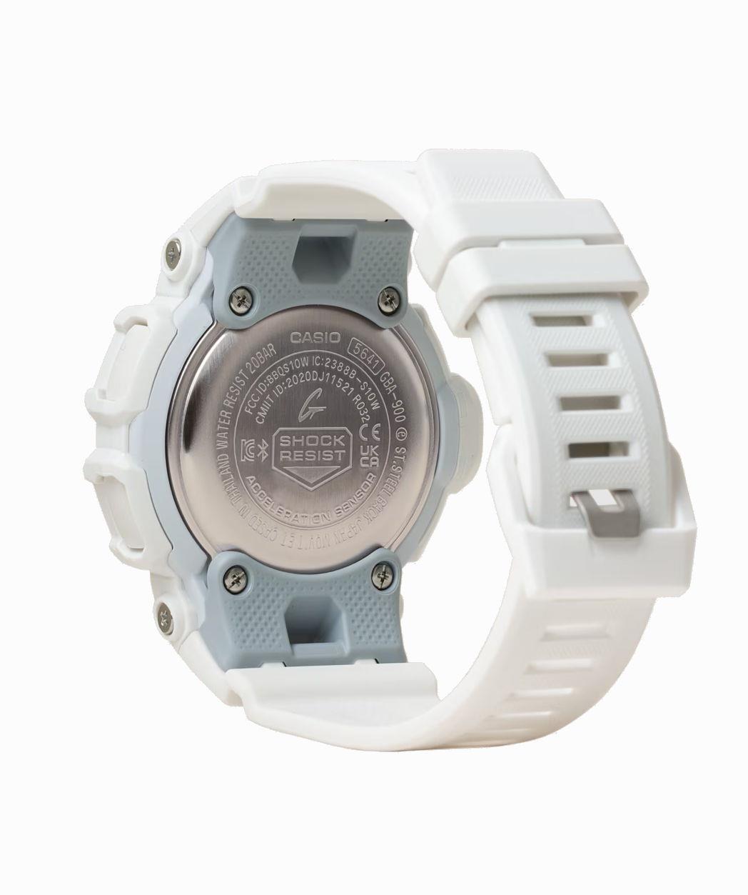 Casio G-Shock GBA900CB-7A from the G-Squad series. MOVE additions to the GBA900 Series of Smartphone Link timepieces. White case and band. Watch features: Smartphone link functions; measure distance using an accelerometer while linked with the GPS function of a smartphone via Bluetooth; calculate your pace; auto lap feature automatically records the time it takes to cover a specific distance; raining management and many more.