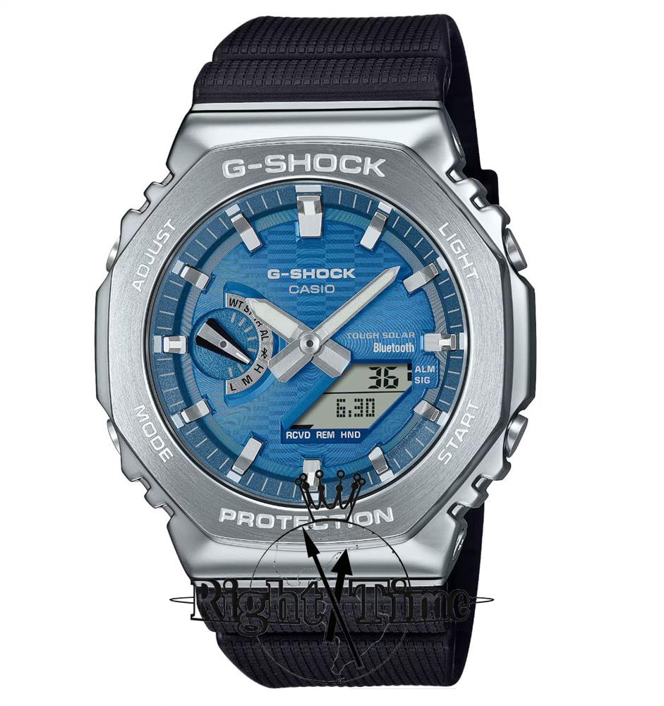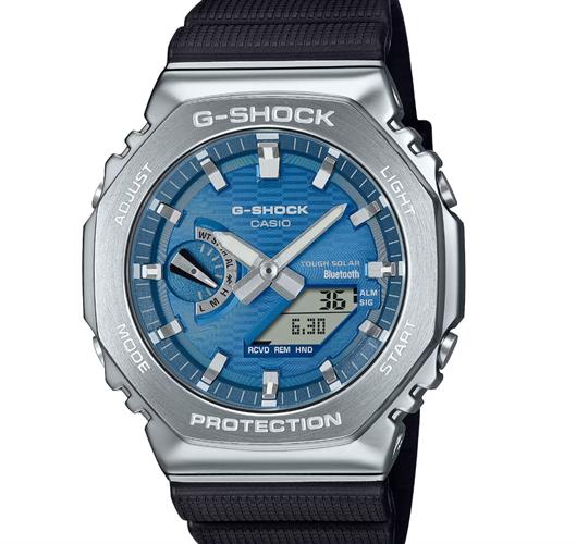 G-Shock G-STEEL GBM2100A-2B by Casio. Smartphone Link via Bluetooth. Tough Solar charging system. Metal case with iconic octagonal bezel. Blue dial. 200 meters water resistant.