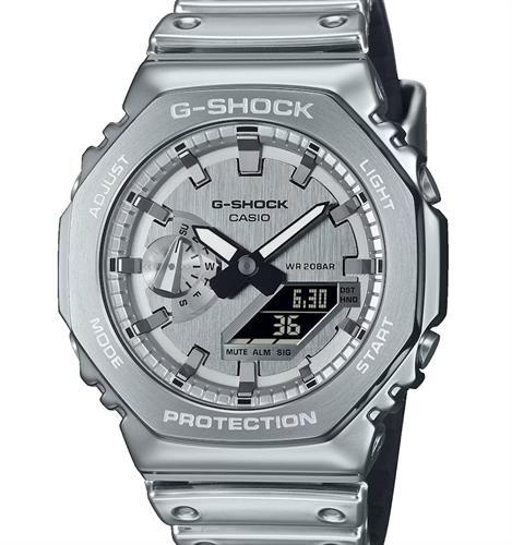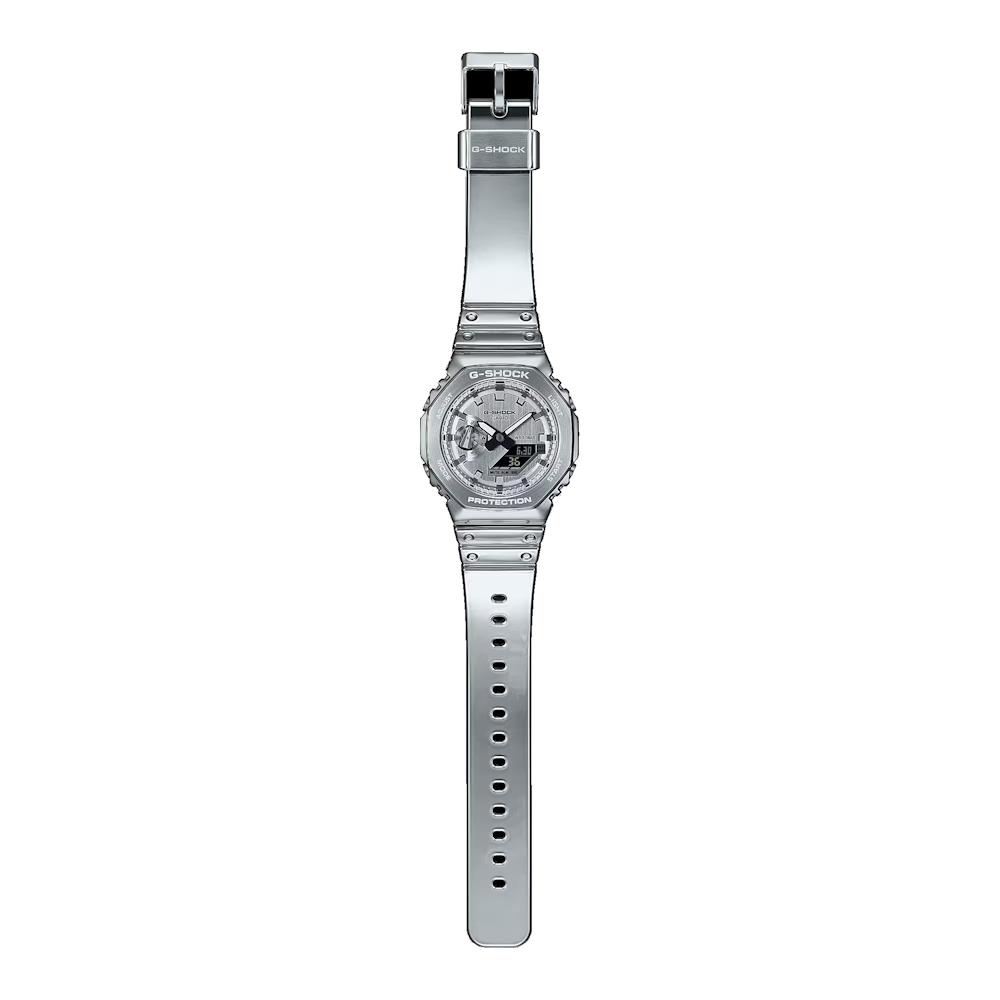 Casio G-Shock GM-2100YM-8A. Dubbed the "CasiOak" due to the octagonal bezels resemblance to the famous "Royal Oak" from Audemars Piguet. Stainless steel and resin case and metallic silicon strap. A mere 11.5 mm thick, which is the thinnest among G-SHOCK combination models. Metallic dial. Features include stopwatch, count-down timer, world time, and a built-in LED. Water resistant to 200 meters.