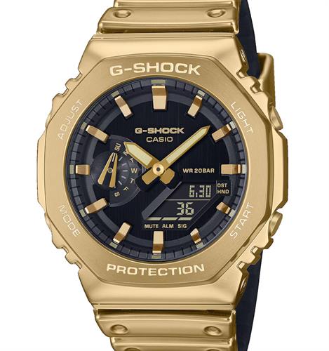 Casio G-Shock GM-2100YMG-9A. Dubbed the "CasiOak" due to the octagonal bezels resemblance to the famous "Royal Oak" from Audemars Piguet. Gold tone stainless steel and resin case with silicon strap. A mere 11.5 mm thick, which is the thinnest among G-SHOCK combination models. Black dial. Features include stopwatch, count-down timer, world time, and a built-in LED. Water resistant to 200 meters.
