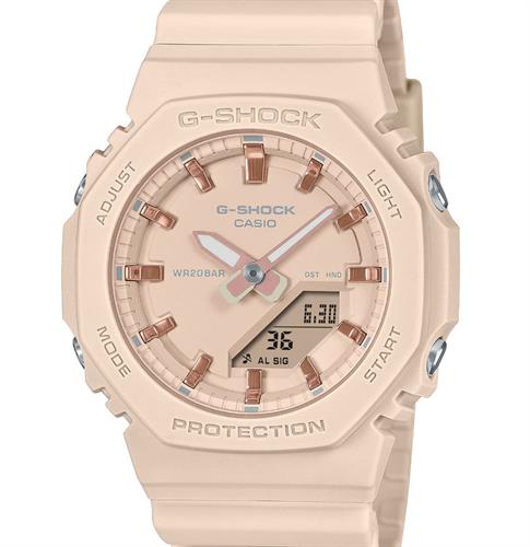 Casio G-Shock GMA-P2100M-4A. Dubbed the "CasiOak" due to the octagonal bezels resemblance to the famous "Royal Oak" from Audemars Piguet. New smaller size beige pink resin case and band, reinforced with carbon fibers for extra toughness. Beige pink dial with rose gold accents. Features include stopwatch, count-down timer, world time, and a built-in LED. Water resistant to 200 meters.