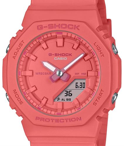 Casio G-Shock GMAP2100-4A. Dubbed the "CasiOak" due to the octagonal bezels resemblance to the famous "Royal Oak" from Audemars Piguet. New smaller size bright pink resin case and band, reinforced with carbon fibers for extra toughness. Pink dial with pink accents. Features include stopwatch, count-down timer, world time, and a built-in LED. Water resistant to 200 meters.
