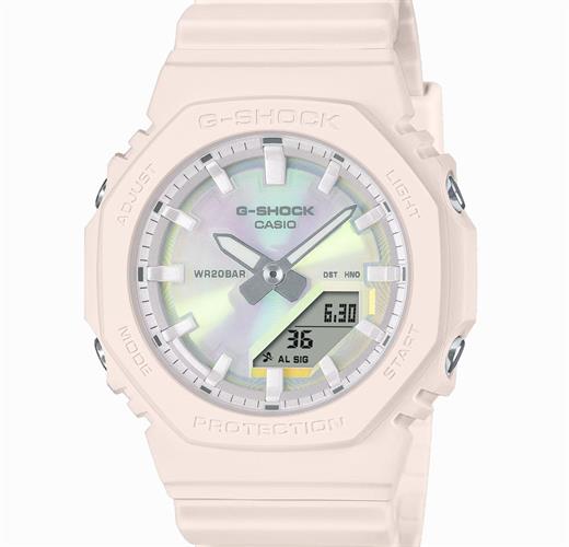 Casio G-Shock GMA-P2100PC-4A. Dubbed the "CasiOak" due to the octagonal bezels resemblance to the famous "Royal Oak" from Audemars Piguet. New smaller size blush resin case and band, reinforced with carbon fibers for extra toughness. Silver dial. Features include stopwatch, count-down timer, world time, and a built-in LED. Water resistant to 200 meters.