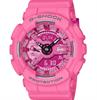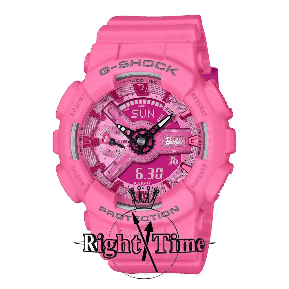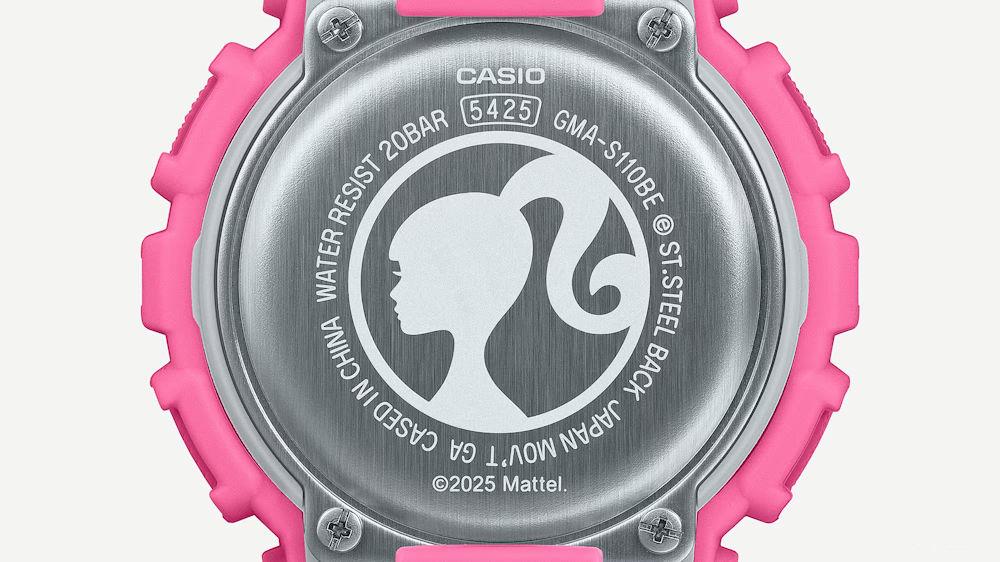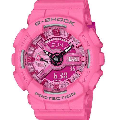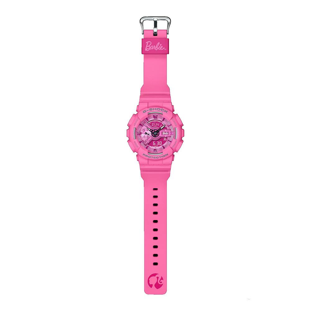 G-SHOCK Barbie Collaboration watch model GMAS110BE-4A for free-thinking, tough women with strength at their core. The monochromatic bright pink base is accented throughout with the Barbie logo and depictions of her silhouette. The original design is echoed in the watch`s special packaging, as well.