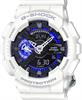 G-Shock S Series model GMAS110CW-7A3. White case and band. Equipped with an Auto LED light, 4 daily alarms, 1/100th stopwatch and a Speed Indicator. Other features: Shock Resistant, 200 Meter Water Resistant, Magnetic Resistant. Black and blue dial
