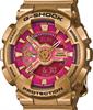 G-Shock S Series in gold. Yellow gold tone case and band. Pink dial. Equipped with an Auto LED light, 4 daily alarms, 1/100th stopwatch and a Speed Indicator. Other features: Shock Resistant, 200 Meter Water Resistant, Magnetic Resistant
