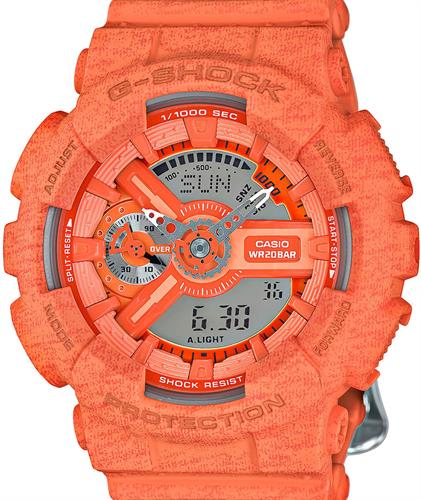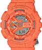 G-Shock S Series model GMAS110HT-4A. Orange case and band with heather print pattern. Equipped with an Auto LED light, 4 daily alarms, 1/100th stopwatch and a Speed Indicator. Other features: Shock Resistant, 200 Meter Water Resistant, Magnetic Resistant.