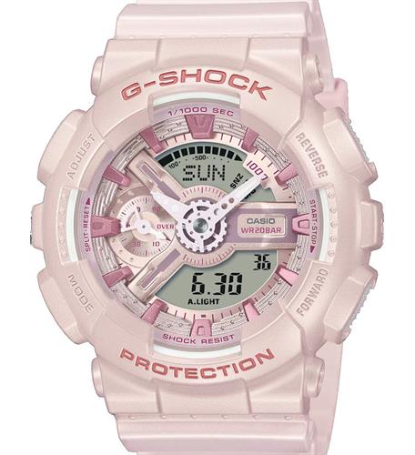 G-Shock S Series model GMAS110ST-4A. Light pink case and band. Equipped with an Auto LED light, 4 daily alarms, 1/100th stopwatch and a Speed Indicator. Other features: Shock Resistant, 200 Meter Water Resistant, Magnetic Resistant. Light pink dial