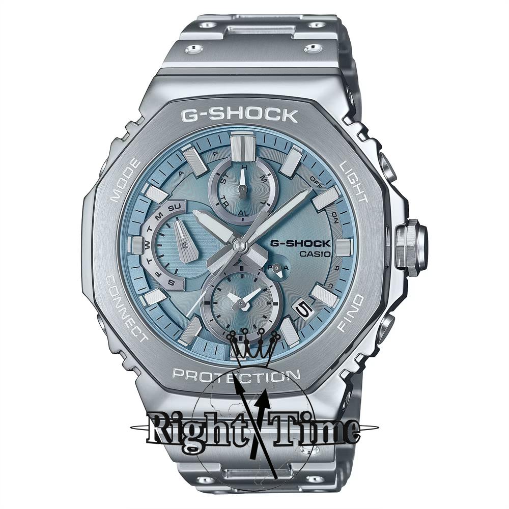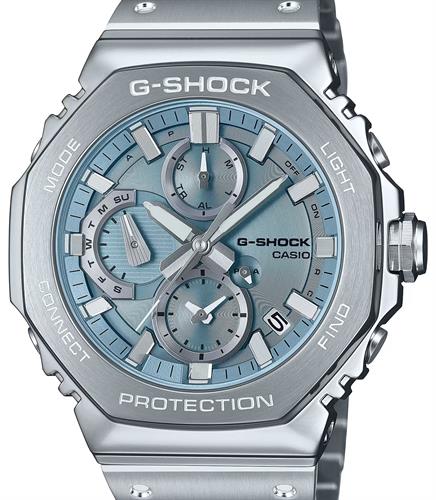 Casio G-Shock Metal series model GMCB2100AD-2A. Solid stainless steel case and bracelet. Light blue analog dial chronograph with steel tone hands and markers. Tough solar powered with Bluetooth mobile link. Water resistant to 200 meters.