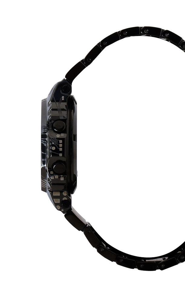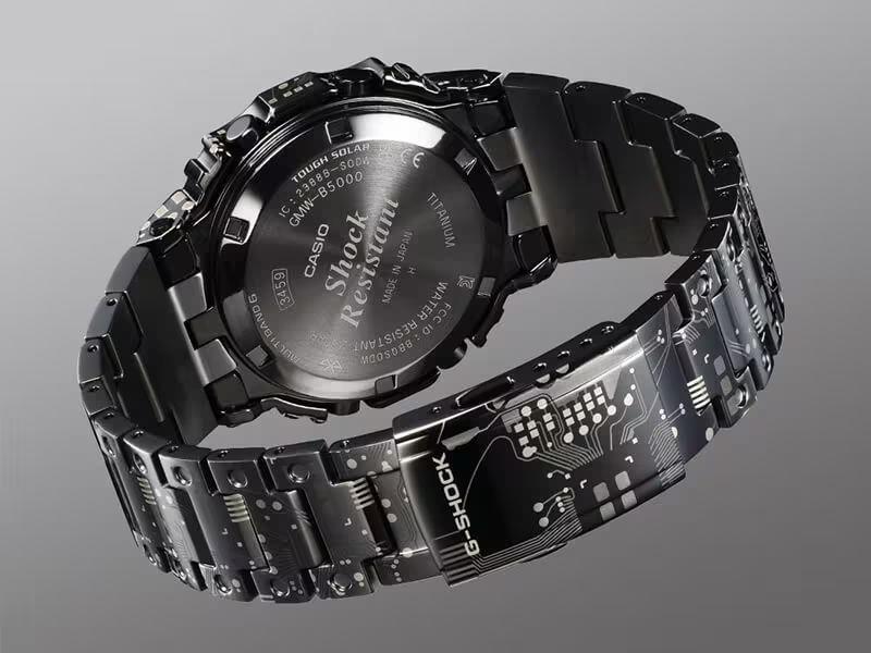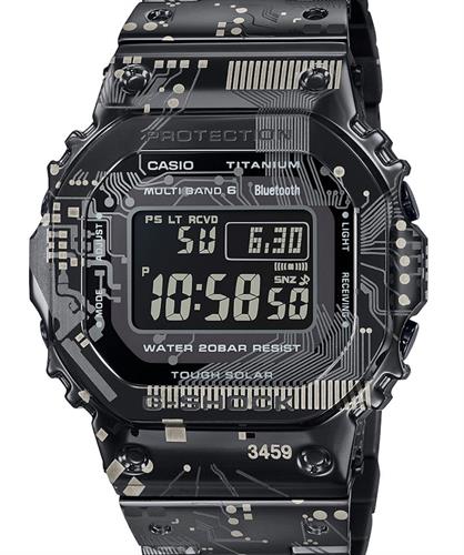 G-Shock Full Metal 5000 Series model GMW-B5000TCC-1. All titanium case and bracelet with one-of-a-kind laser Camouflage Print, Solar Powered, Bluetooth smartphone link, Multi-band receiver, 200 Meter Water Resistant. Black digital dial