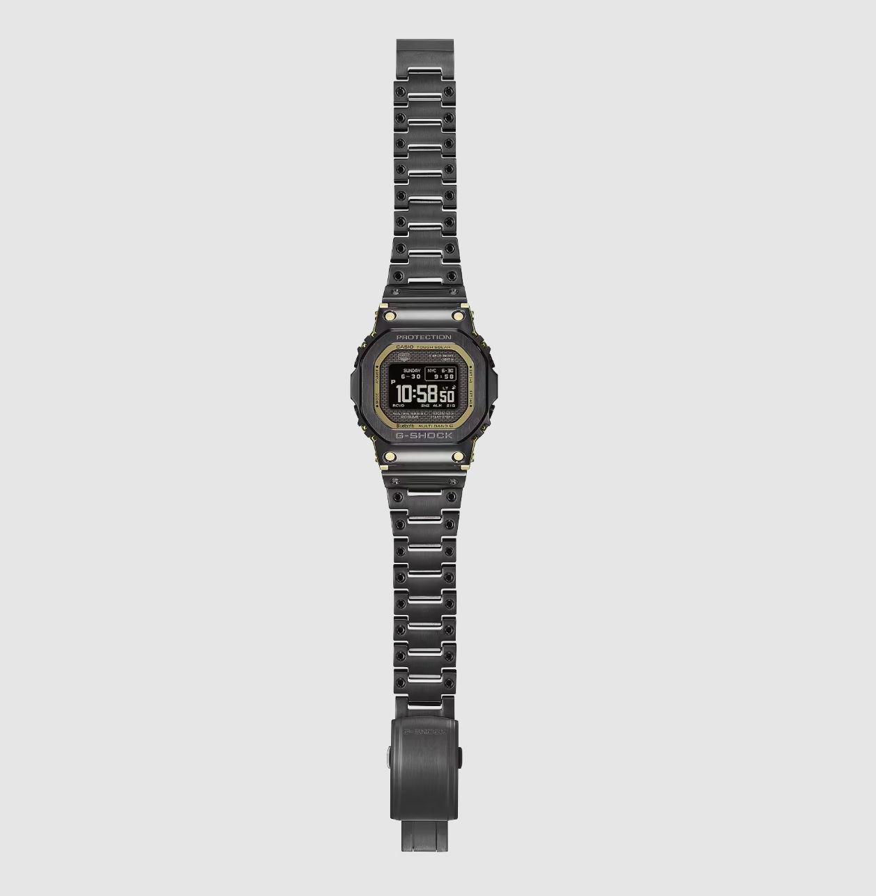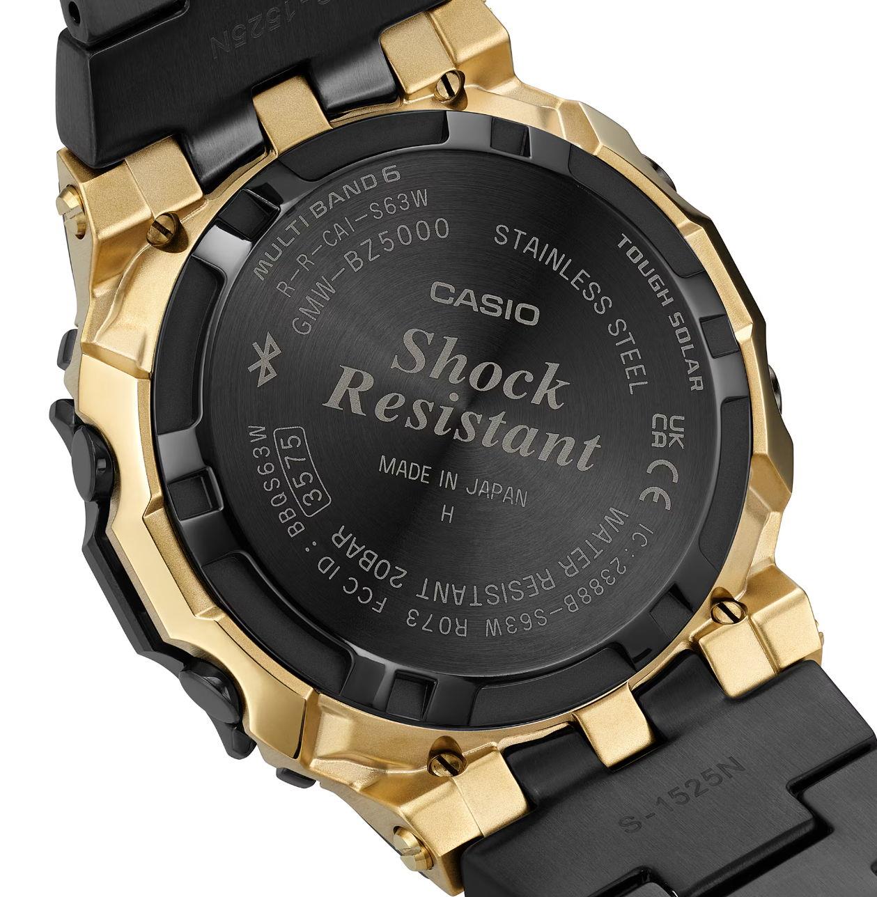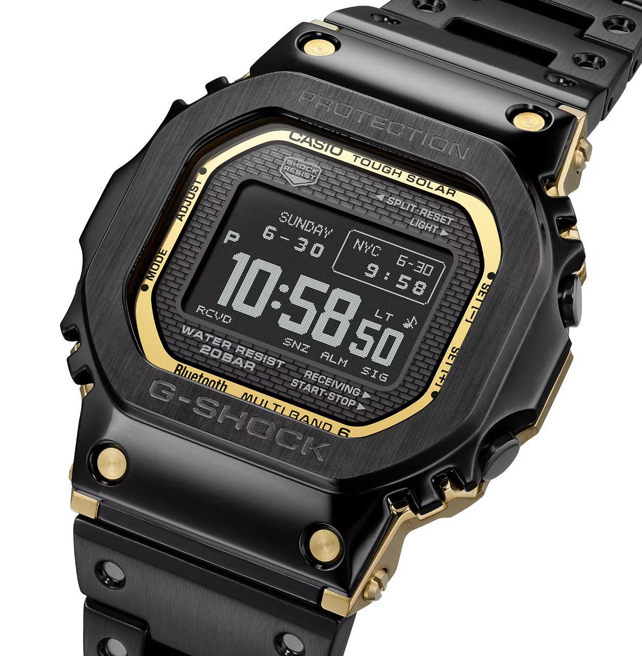 G-Shock Full Metal 5000 Series model GMW-BZ5000BD-1. Black coated stainless steel case and bracelet with gold tone accents, Solar Powered, Bluetooth smartphone link, Multi-band receiver, 200 Meter Water Resistant. Black digital dial