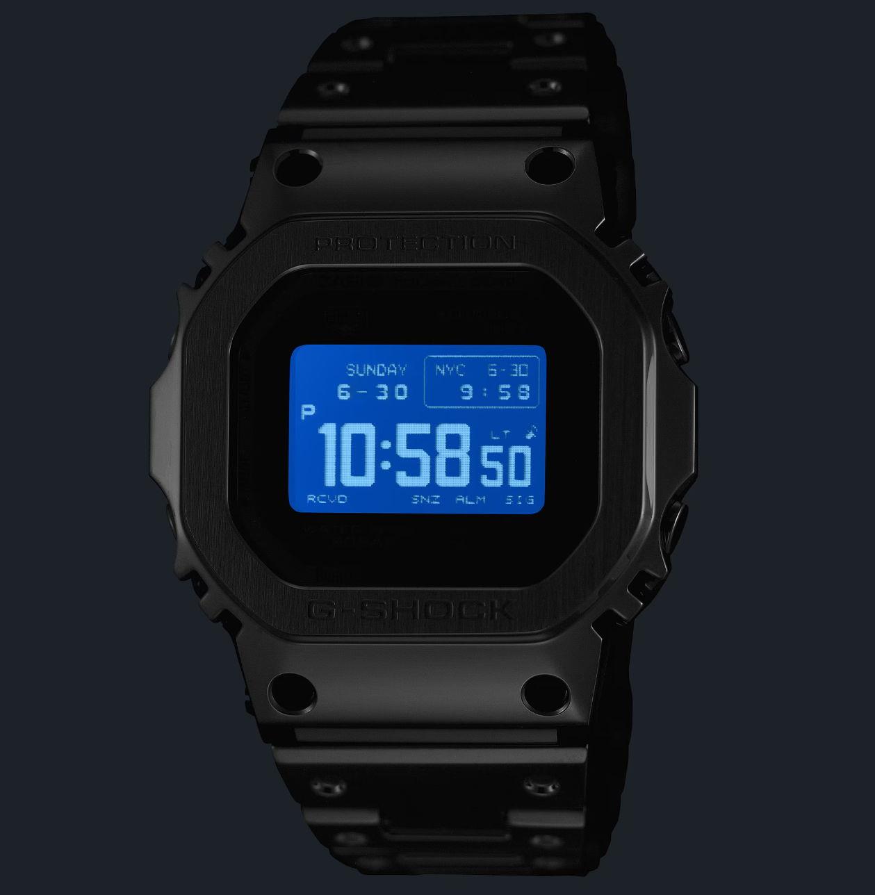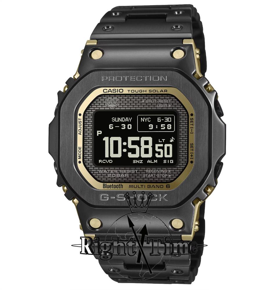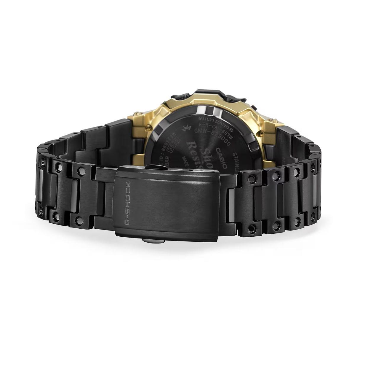 G-Shock Full Metal 5000 Series model GMW-BZ5000BD-1. Black coated stainless steel case and bracelet with gold tone accents, Solar Powered, Bluetooth smartphone link, Multi-band receiver, 200 Meter Water Resistant. Black digital dial
