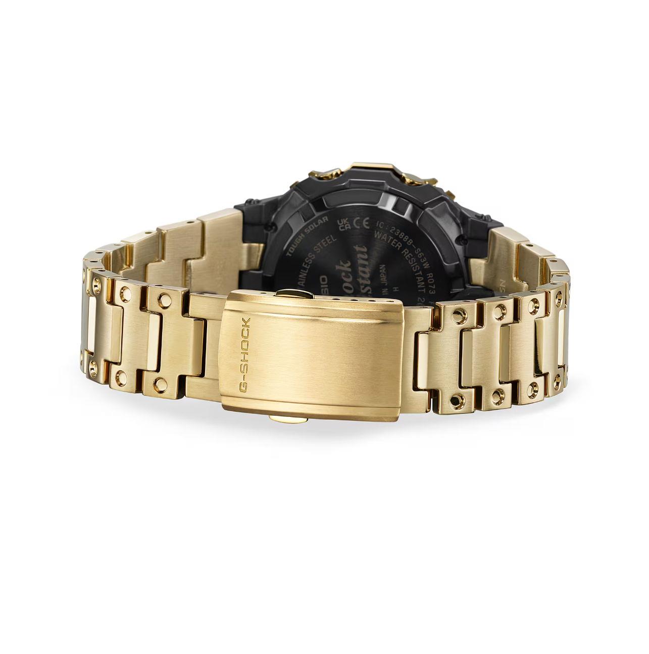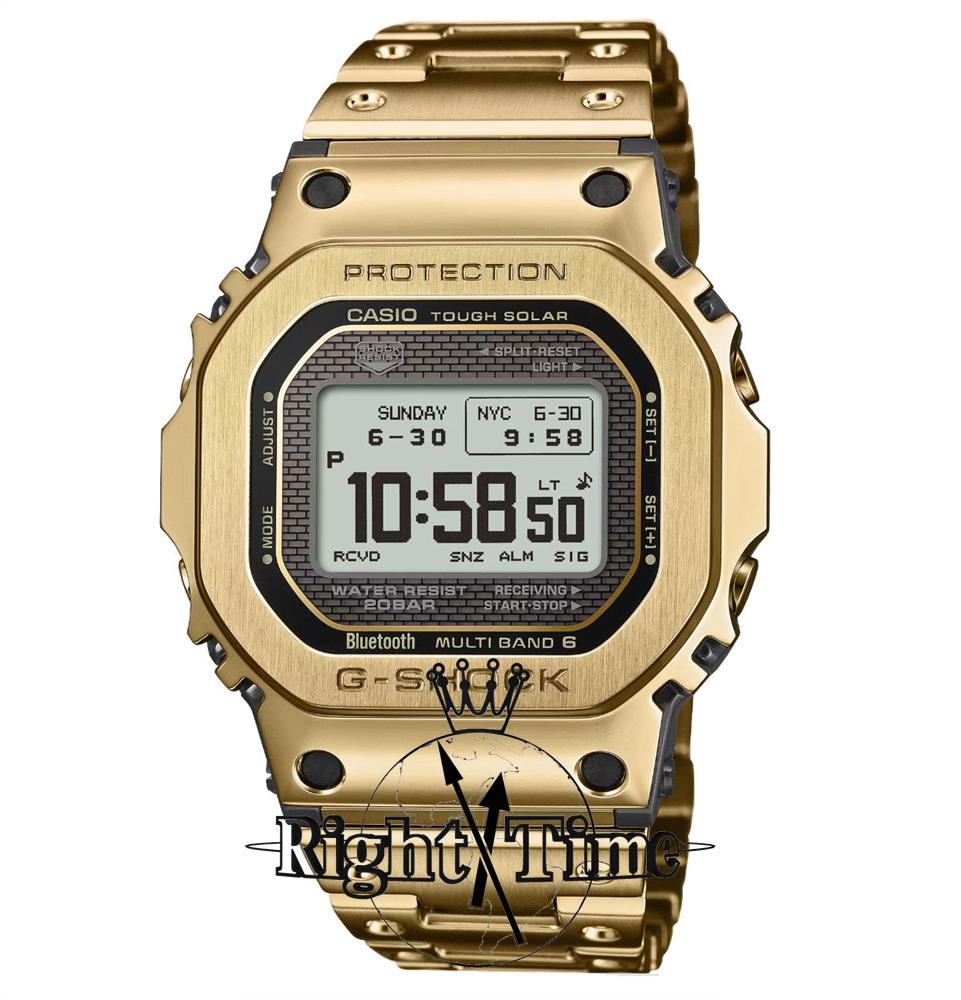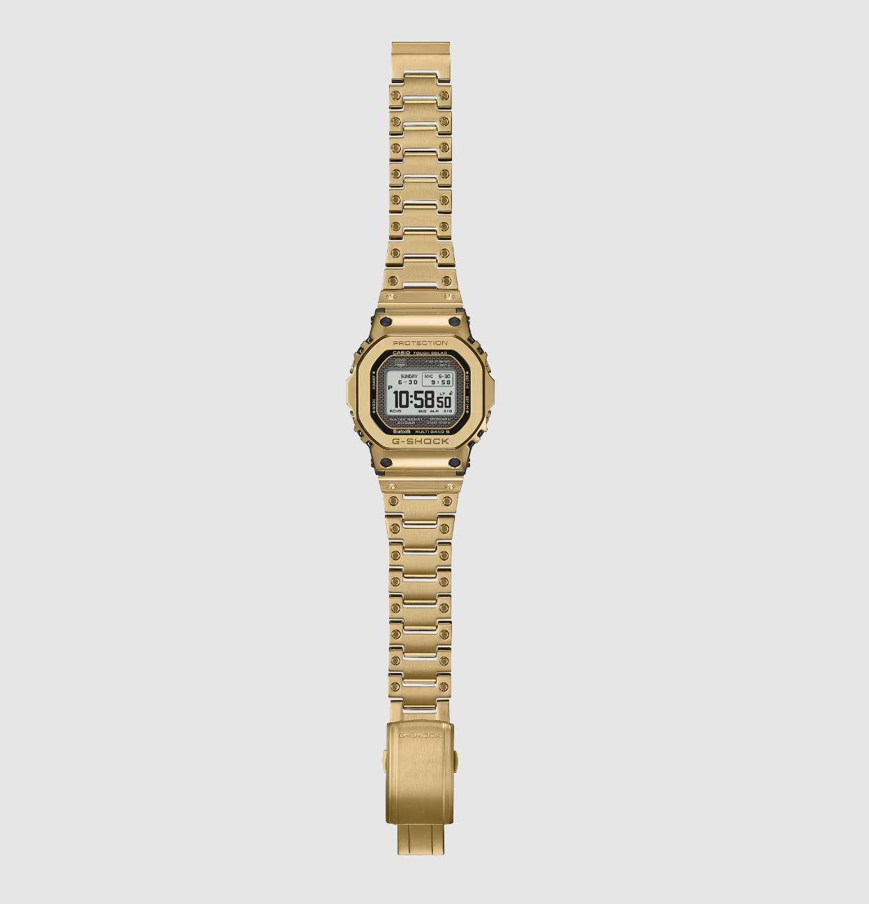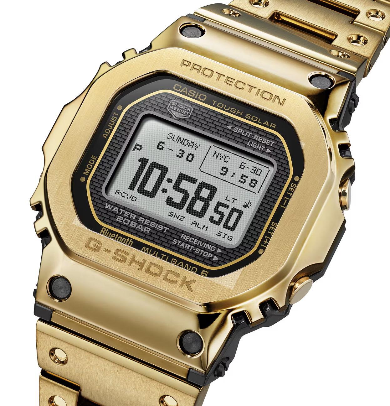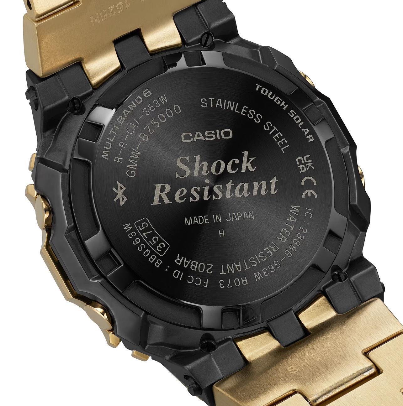 G-Shock Full Metal 5000 Series model GMW-BZ5000GD-9. Gold plated stainless steel case and bracelet, Solar Powered, Bluetooth smartphone link, Multi-band receiver, 200 Meter Water Resistant. Black digital dial