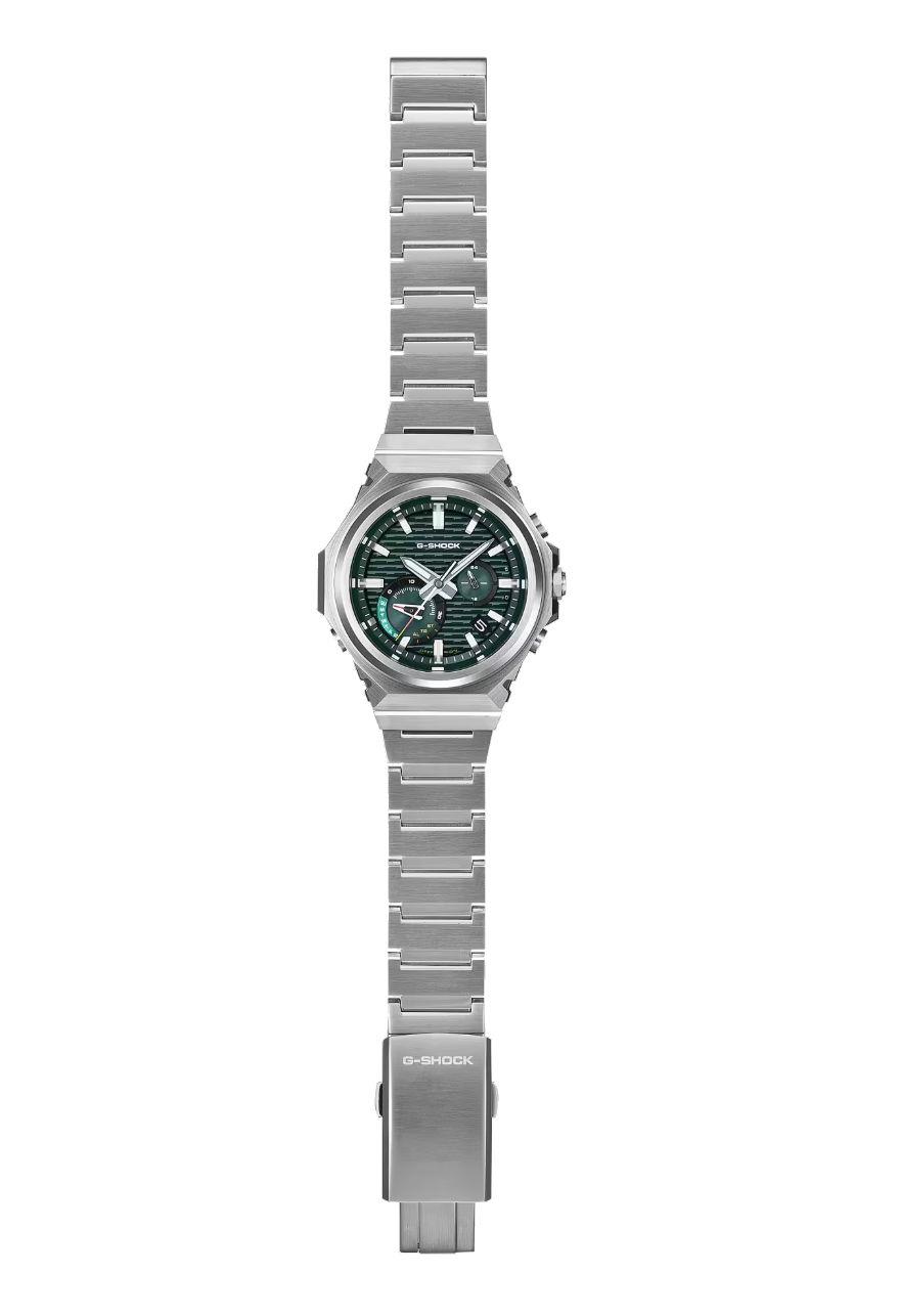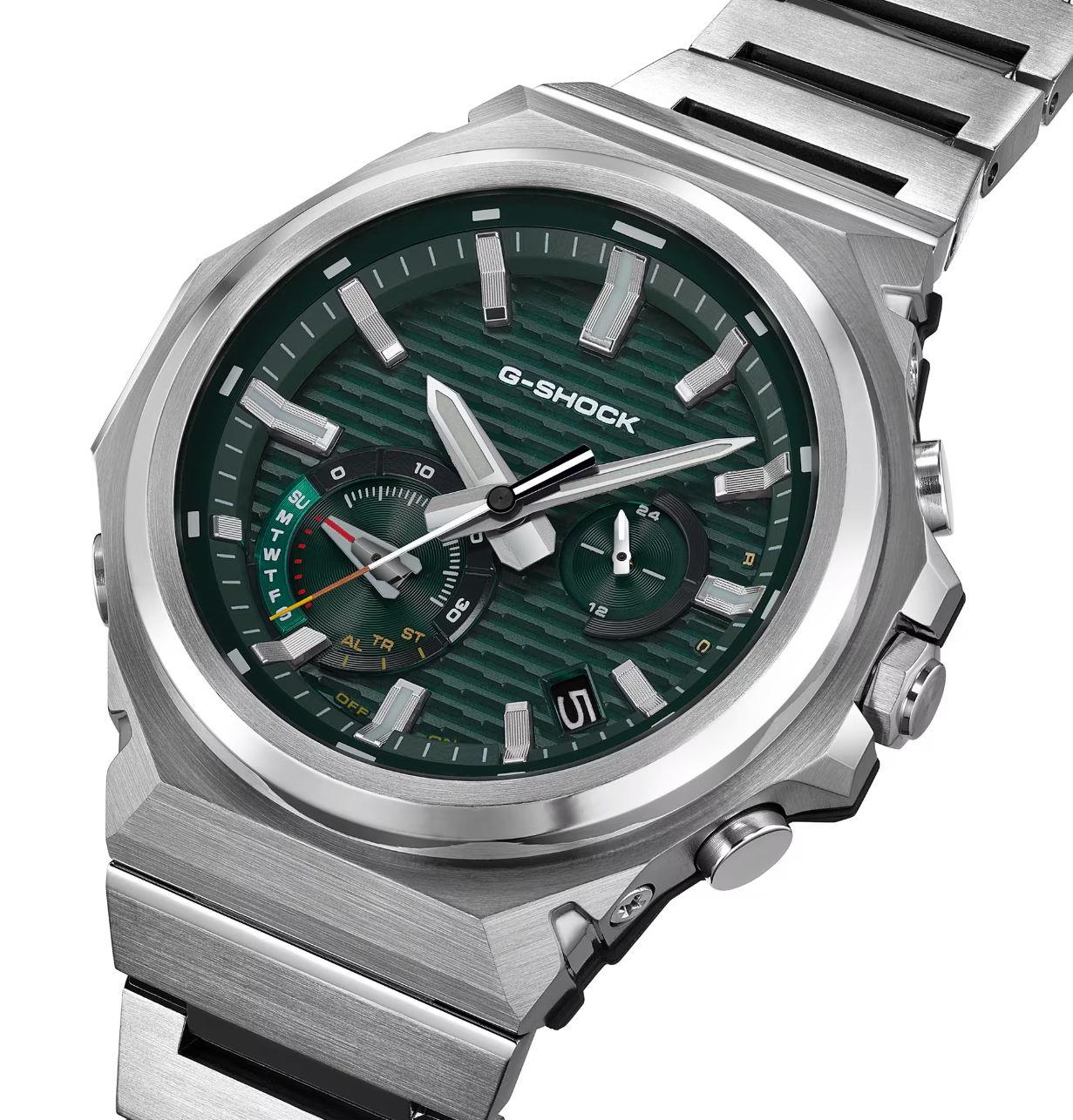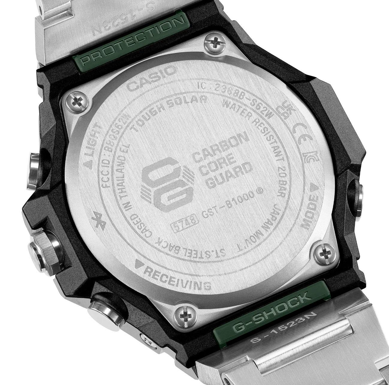 G-Shock G-STEEL Series model GSTB1000D-3A by Casio. Solar powered. Stainless steel case and bracelet. Green dial. 200 meters water resistant.