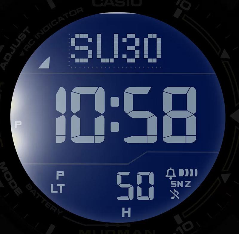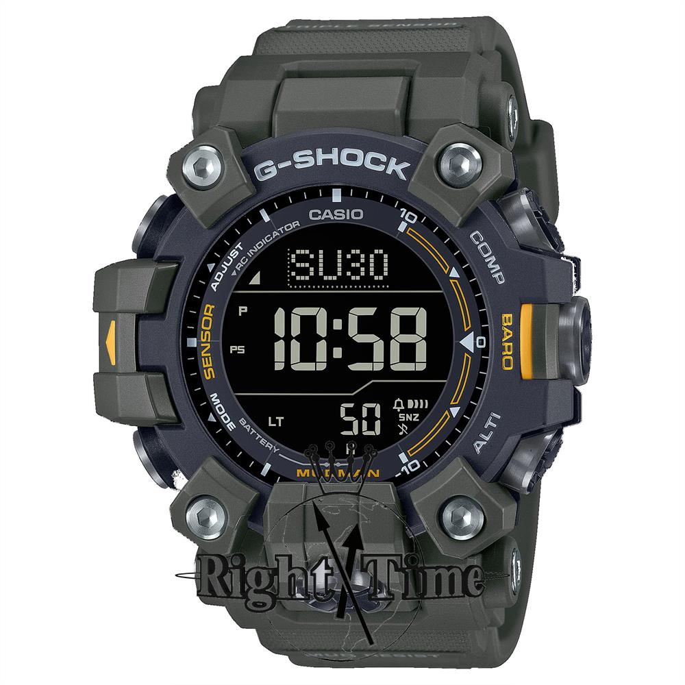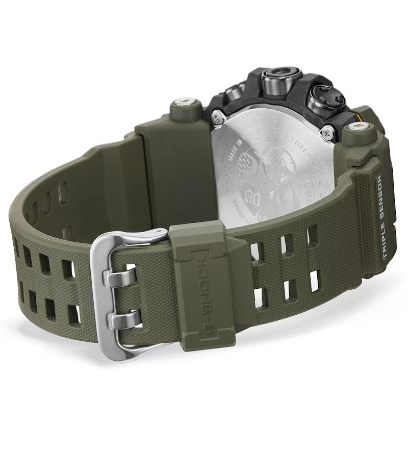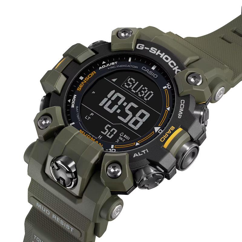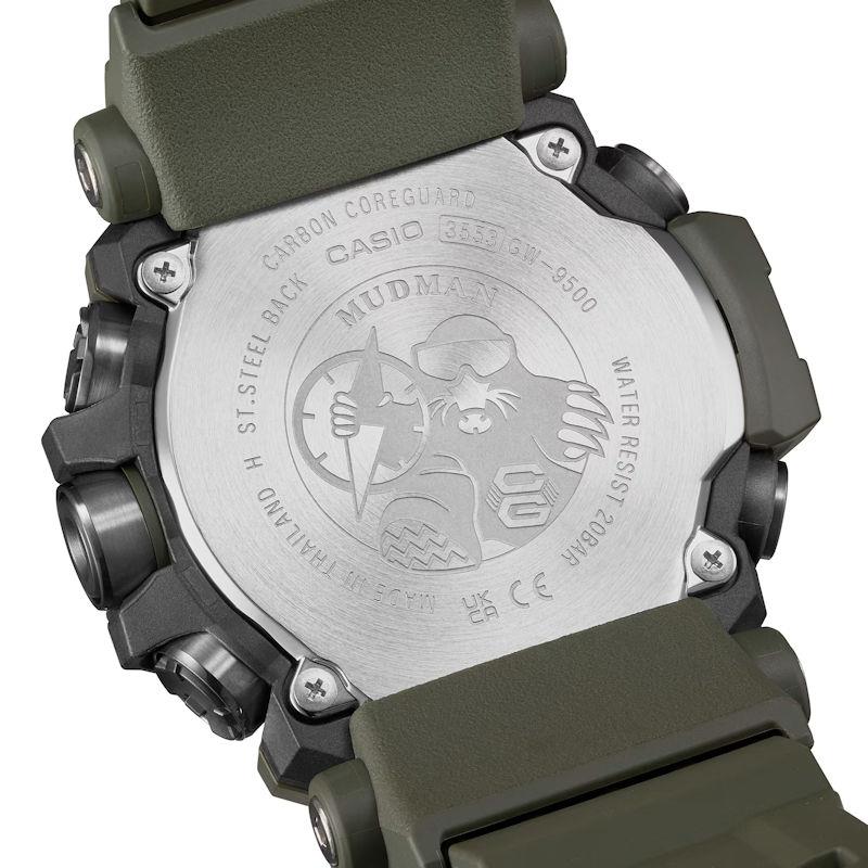 Casio G-Shock Master of G Land Series Mudman. Green color case and band constructed of bio-based resins derived from renewable organic resources. Digital dual-layer LCD dial. Mineral glass crystal. Tough solar movement with Multi-band atomic timekeeping. Functions include compass, altimeter, barometer, thermometer, stopwatch, alarms, timer, and world time. Factory model GW-9500-3.