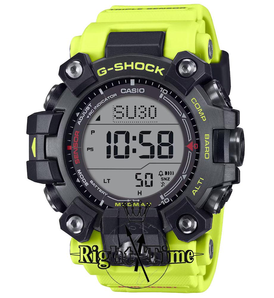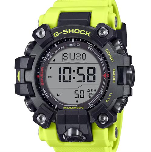 Casio G-Shock Master of G Land Series Mudman. Black color case. Band has the same bright yellow used for emergency rescues and safety signs. Digital dual-layer LCD dial. Mineral glass crystal. Tough solar movement with Multi-band atomic timekeeping. Functions include compass, altimeter, barometer, thermometer, stopwatch, alarms, timer, and world time.