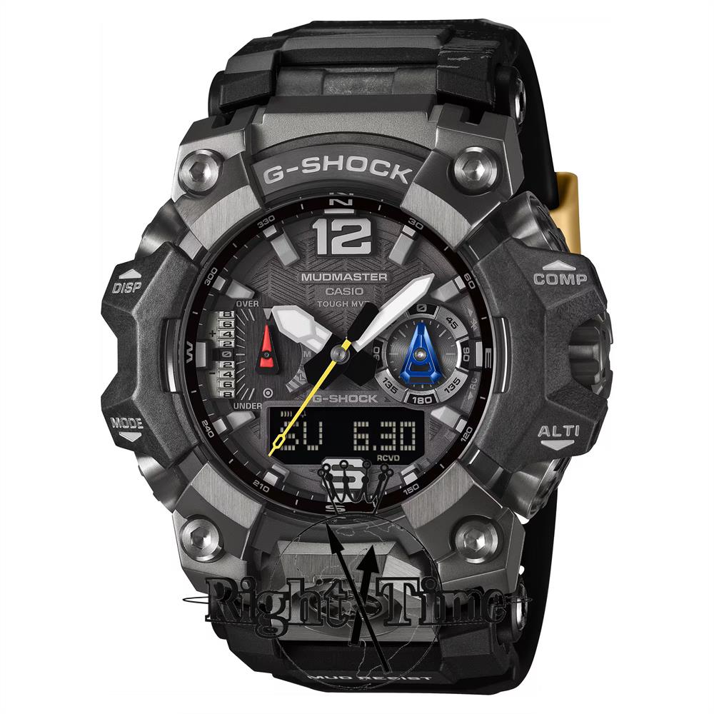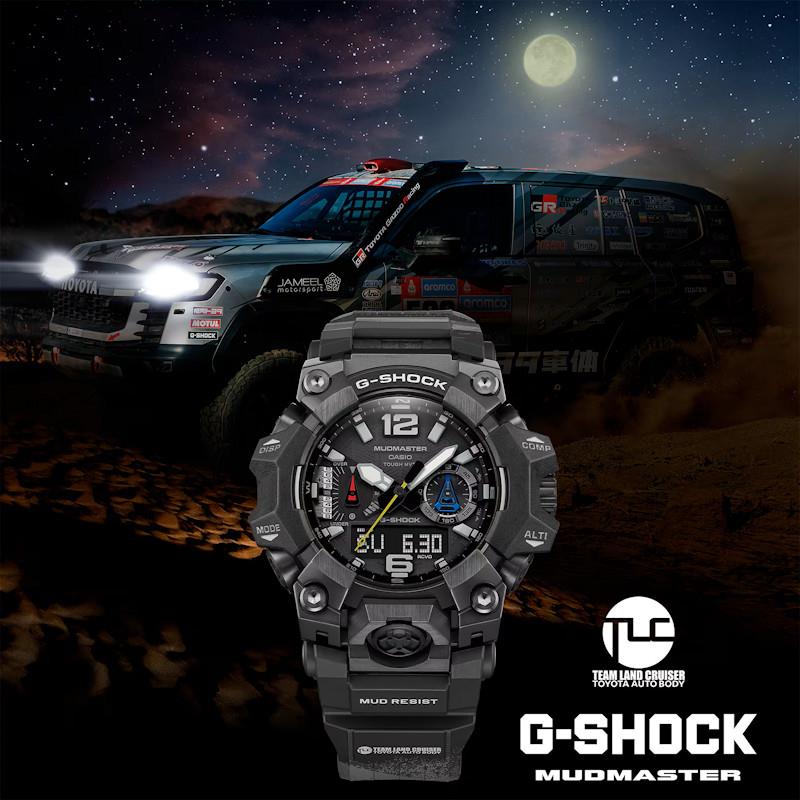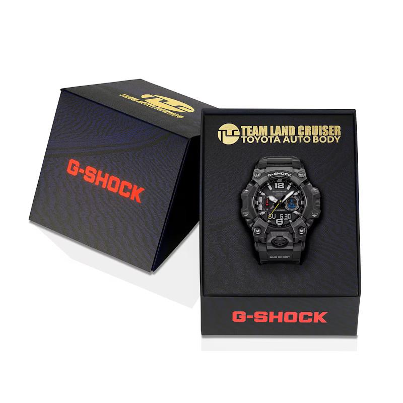 Casio G-Shock Master of G Mudmaster model GWGB1000TLC1A. Collaboration between Casio and Team Land Cruiser Toyota Auto Body (TLC), this model is inspired by the grueling nighttime legs of the Dakar Rally. Combination analog/digital. Black dial with build in LED light. Movement features include solar powered, Multi-band radio controlled, Bluetooth connected, and a triple sensor (altimeter, barometer, compass). Functions include world time, stopwatch, timer, and multiple alarms. Sapphire crystal. Water resistant to 200 meters. Black resin strap.
