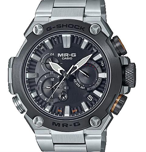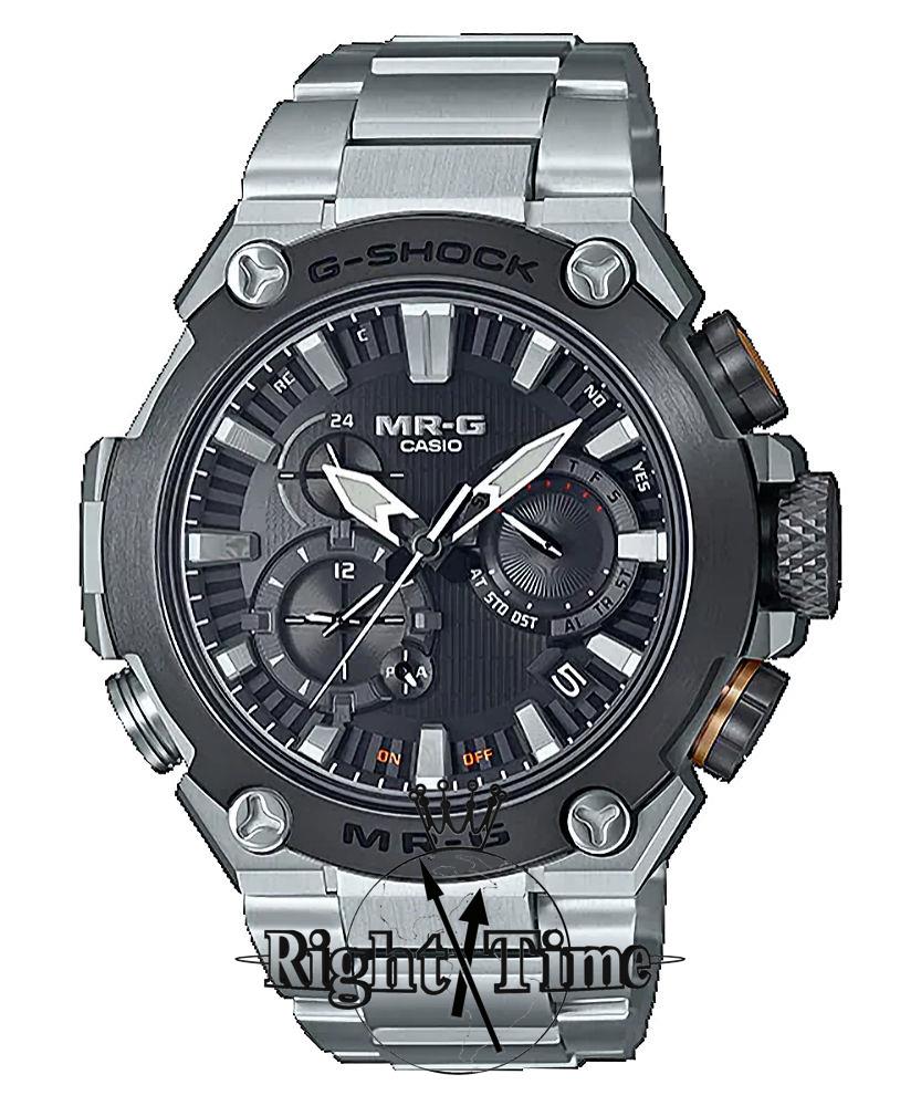 Casio G-Shock MR-G model MRGB2000D-1A. Manufactured on the Premium Production Line at the Yamagata Casio mother factory in Japan, the MR-G module is solar powered, Multi-band 6 radio controlled, and Bluetooth connected. Other functions include stopwatch, alarm, timer, dual time, and a built in LED. The case and bracelet are made of solid titanium with a deep layer hardening treatment. Black dial with raised polished steel tone markers with luminous hands and marker dots. Scratch resistant sapphire crystal. Both shock and magnetic resistant, as well as water resistant to 200 meters.