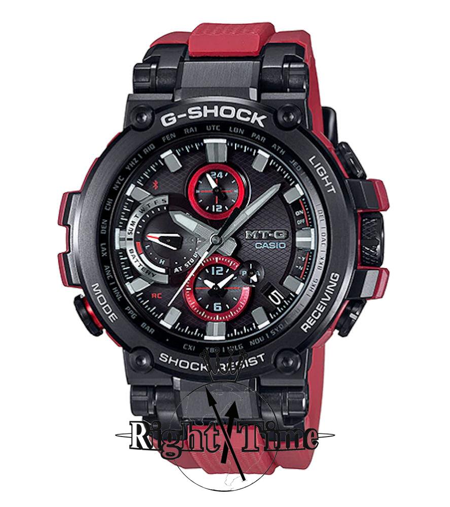 MT-G Connected by Casio G-Shock. Model MTGB1000B-1A4. Black PVD plated steel case. Red rubber band. Black color dial with red sub-dials. 2-way Time Sync (BLE/MB6). BLE Connected. Super Illuminator. New Band/Case Structure. Sapphire crystal