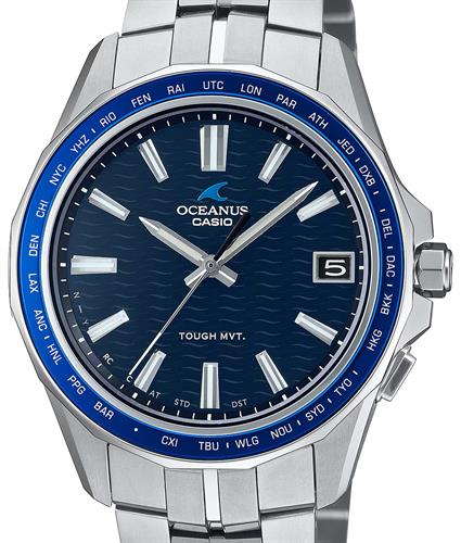 Oceanus Manta series model OCW-S400-2AJF. Pure titanium case and bracelet. Sapphire crystal with anti-glare coating. Water resistant to 100 meters. Textured blue dial. World time bezel with blue sapphire glass cover. Tough solar. Multi-Band 6. Bluetooth connected.