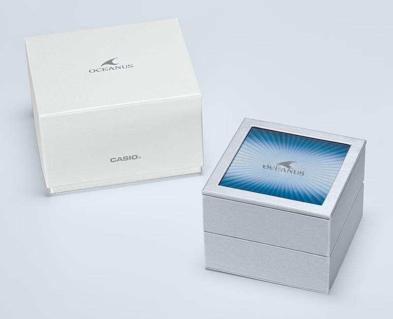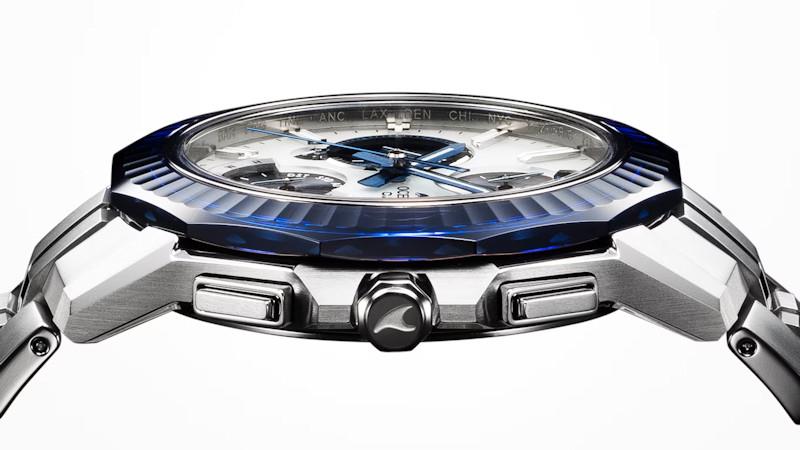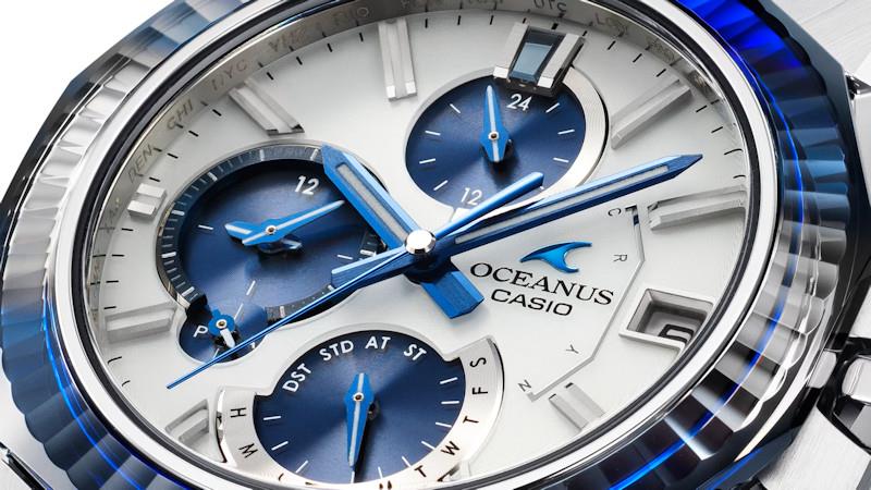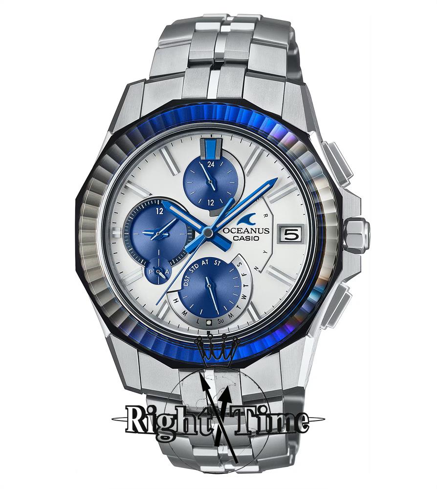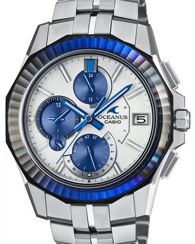 Oceanus Manta series model OCWS6000PB7A. Pure titanium case and bracelet. Sapphire crystal with anti-glare coating. Water resistant to 100 meters. White dial with blue color sub-dials. Sapphire crystal bezel with a unique cutting technique, themed “Platinum Blue.” Tough solar, Multi-Band 6 and Bluetooth connected. Limited Edition of 600 pieces.