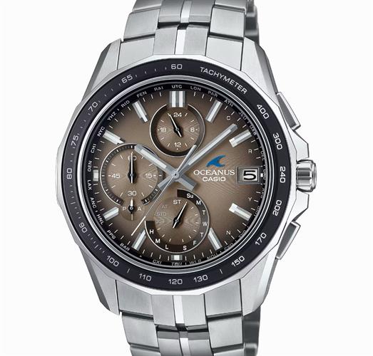 Oceanus Manta series model OCWS7000RA-5A. Pure titanium case and bracelet. Sapphire crystal with anti-glare coating. Water resistant to 100 meters. Brown dial. Brown tachymeter bezel. Tough solar. Bluetooth connected.