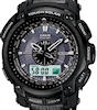 All black, all titanium Casio PROTREK solar powered PRW5100YT-1Limited Edition model with Atomic Timekeeping technology. Watch functions: Compass , Altimeter, Barometer, Temperature sensors and much more. Black PVD titanium metal band. Analog-Digital display. Luminous hands and markers. Limited Edition