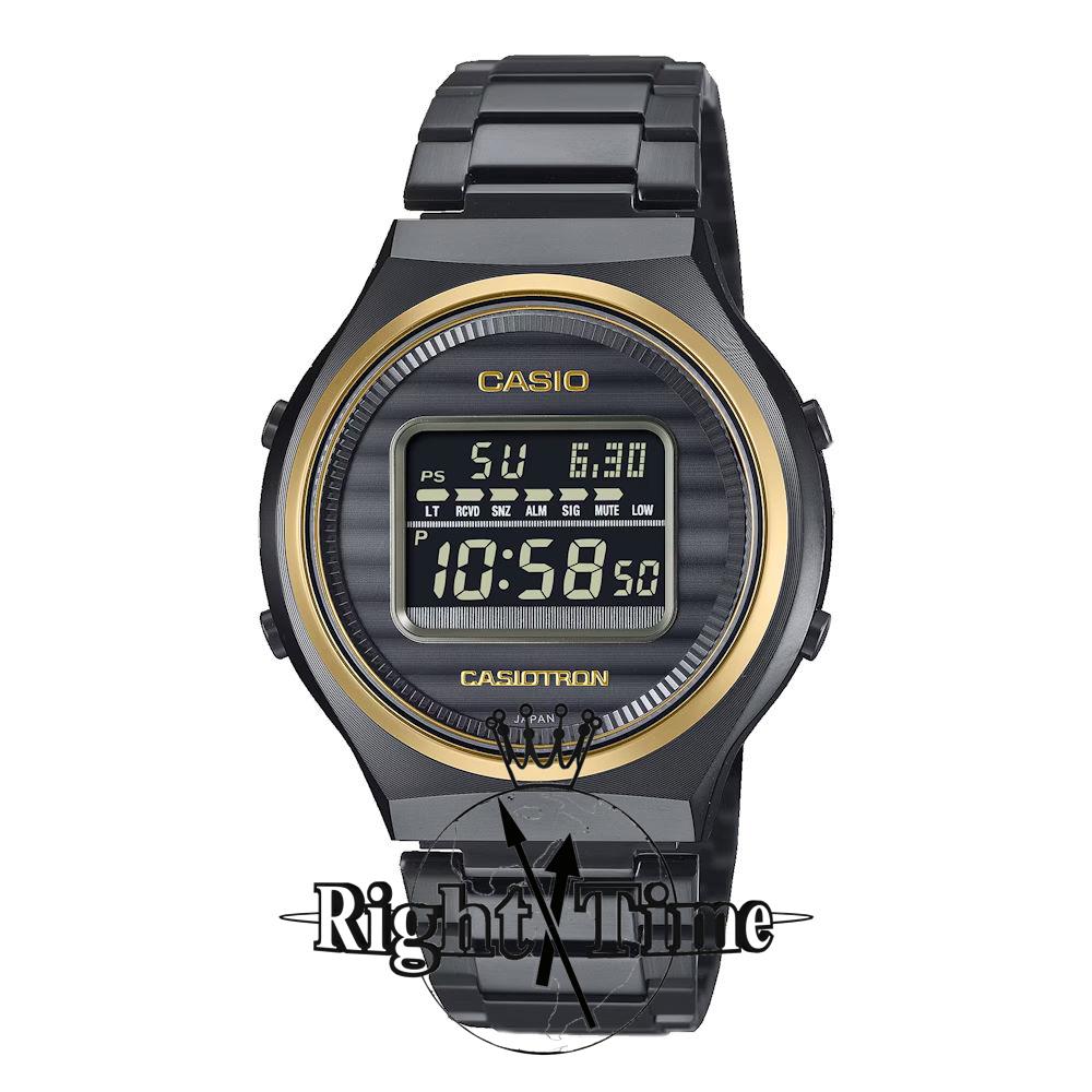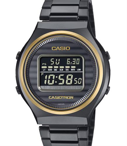 Casio Casiotron model TRN50ZE-1A. Re-creation of the first-ever Casio wristwatch. Solid stainless steel case and bracelet with black and gold tone plating. Digital display. Solar powered, Multi-band timekeeping, and Bluetooth connectivity. Water resistant to 50 meters.