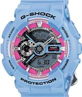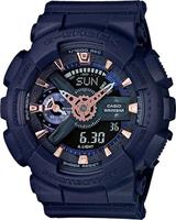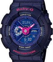 Baby-G by Casio model BA110PP-2A. Navy blue color case, and band with pink color accents. Digital and analog dial. Resin band. 100 meters water resistant. LED-Backlight