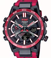 Casio Wave Ceptor chronograph model WVQ550A-1A2V. Atomic Timekeeping. Dual Time. Steel case. Black dial with red accents. Black rubber band. 100 meter water resistant.