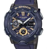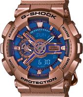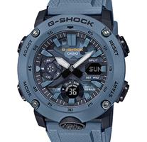 Casio G-Shock GMAP2100-2A. Dubbed the "CasiOak" due to the octagonal bezels resemblance to the famous "Royal Oak" from Audemars Piguet. New smaller size blue resin case and band, reinforced with carbon fibers for extra toughness. Blue dial with rose gold accents. Features include stopwatch, count-down timer, world time, and a built-in LED. Water resistant to 200 meters.
