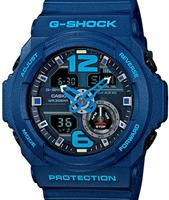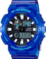 G-Shock G-Lide GBX100-2A by Casio. Blue color case and band. Black dial. ED backlight (Super illuminator). Auto light switch, selectable illumination duration (1.5 seconds or 3 seconds), afterglow. 200 Meter Water Resistant.