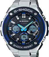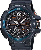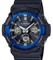 Casio G-Shock watch with Atomic Timekeeping and Tough Solar Power. Black case, dial and band. Blue bezel. Ana-Digital display. World Time in 48-cities.