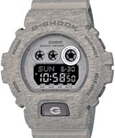 Casio G-Shock 6900 series model DW6900HDS-7. Quartz digital movement. White color resin case and band. Luminous dial with white digital display and blue outlines. Functions include stopwatch, timer, alarm, and backlight.
