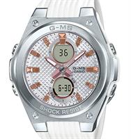 Baby-G by Casio. White color case and band with rose gold tone accents. Digital and analog dial. Resin band. 100 meters water resistant. LED-Backlight