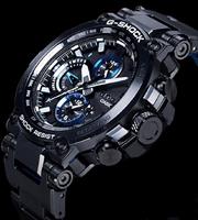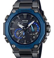 MT-G Connected by Casio G-Shock. Model MTGB1000XB-1A. Black and blue PVD plated steel case. Black rubber band. Black carbon fiber bezel. Black color dial with blue color accents. 2-way Time Sync (BLE/MB6). BLE Connected. Super Illuminator. New Band/Case Structure. Sapphire crystal