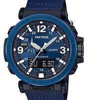 Safari concept PRO TREK. Designed for both outdoor and daily wear. Model PRG600YB-2. Low-temperature resistant (-10C/14F). Watch functions: Compass, Altimeter, Barometer, Temperature sensors and many more. Black/blue case. Blue nylon band. Analog-Digital display. 100m water resistant