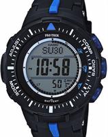 Solar Powered Casio ProTrek model PRG300-1A2 featuring Compass, Altimeter, Barometer, Temperature sensors and many more. Black case and band with blue color accents. Digital display. 100m water resistant