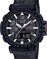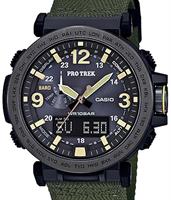 Safari concept PRO TREK. Designed for both outdoor and daily wear. Model PRG600YB-3. Low-temperature resistant (-10C/14F). Watch functions: Compass, Altimeter, Barometer, Temperature sensors and many more. Black case. Military green nylon band. Analog-Digital display. 100m water resistant