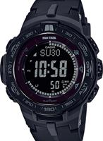 New light weight and slim Casio PROTREK solar powered model PRW3000-1ACR with Atomic Timekeeping technology. Watch functions: Compass , Altimeter, Barometer, Temperature sensors and many more. Black composite band. Analog-Digital display. 100m water resistant
