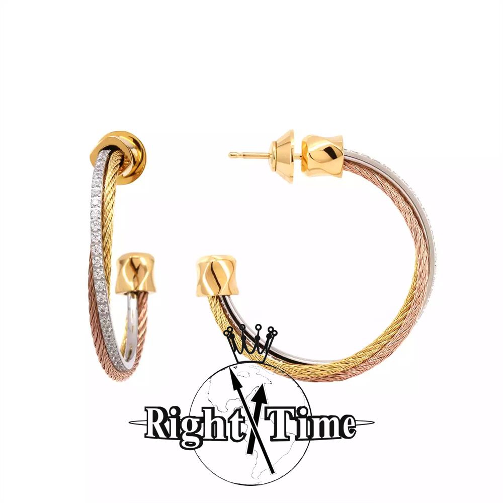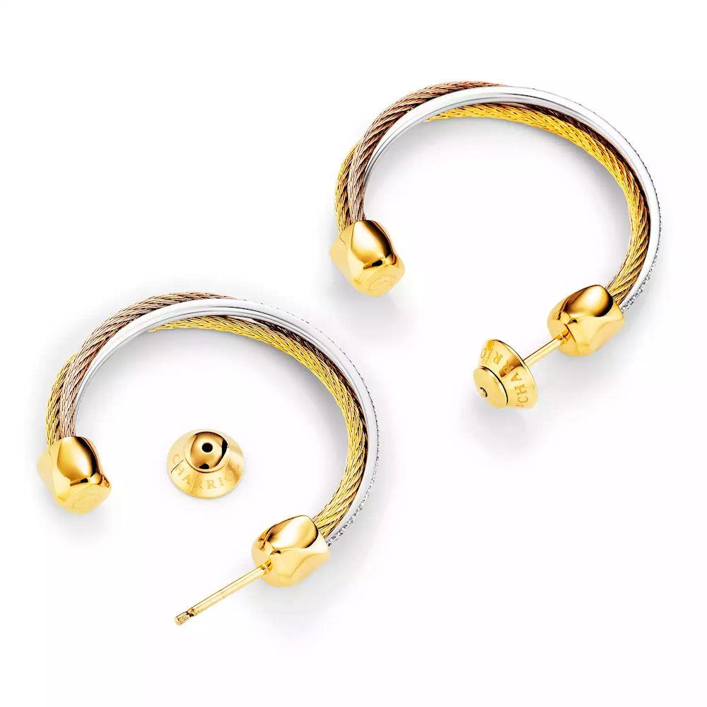 Charriol Celtic Triquetra earrings 2024 model 03-2004-1276-0. Steel, yellow and rose gold PVD plated steel cables. Size: 31mm