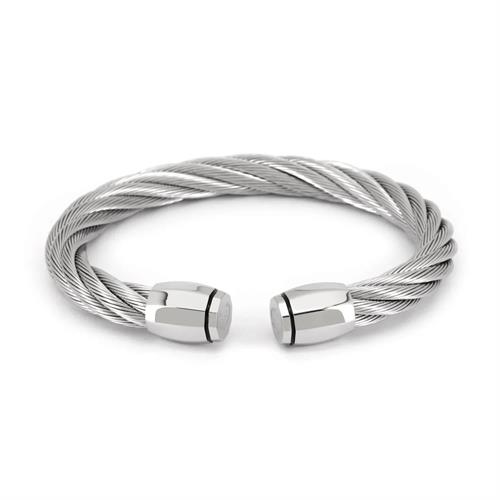 Charriol Celtic Torc Bangle model 04-101-1265-8-L. Size L. 8mm steel cable with end caps emblazoned with the Charriol `C` symbol.