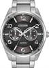 Citizen Eco-Drive wrist watch with CITIZEN Rechargeable by light Eco-Drive Quartz movement. Black dial with day pointer hand, Arabic numerals and luminous hands. Stainless steel case and bracelet. 100m water resistance.
